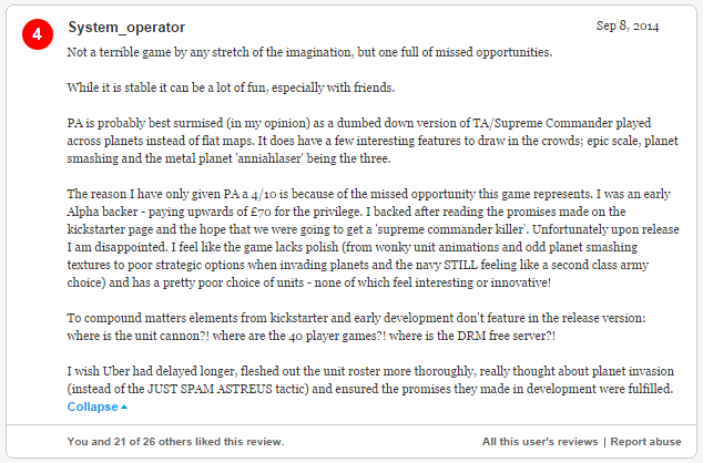 This shows a massive disconnect with the community itself, which most certainly hasn’t been invisible in all of this. I am definitely not the only one dissenting, and the numbers are merely indicative of my initial assessment. It doesn’t matter how many original devlopers from Command & Conquer or Total Annihilation you have if you can’t prove you can complete a product as advertised.