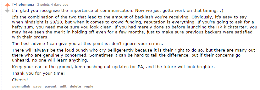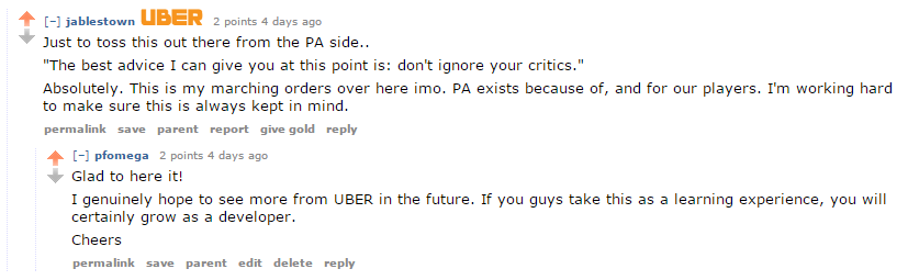 Uber: finish PA. Deliver the goods. Give it a year. Try it again. You don’t suck but you’re missing the point and you are bleeding fans daily. Crowd-sourcing lots of money pays the bills, but it won’t keep the players happy. At the end of the day, they’re the ones who’ll pay the bills if you give them what they want. HR is a good idea, but not until PA gets a few coats of polish.