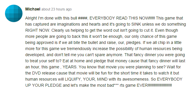 That’s the crux of it all. It just comes across as a money grab. Either out of arrogance or desperation, it doesn’t matter at this point, because Human Resources won’t be funded at any rate. It’s sad, because I am a fan of the RTS genre. I would actually like to see this game made, but Uber has a lot of learning to do before that can happen.